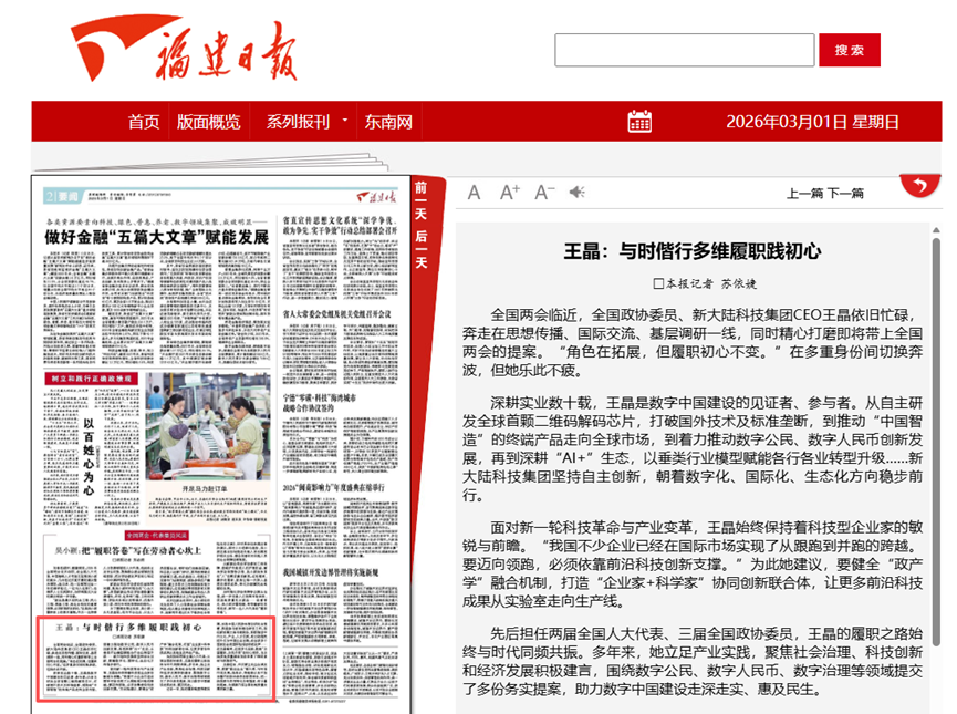 《福建日报》以《王晶:与时偕行多维履职践初心》为题,深入报道王晶“奔走在思想传播、国际交流、基层调研一线,同时精心打磨即将带上全国两会的提案”。